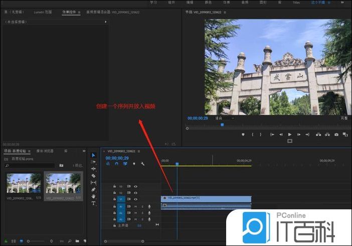2、在来根据项目的要求或视频文件的大小属性来新建一个 序列 ,将导入的视频文件拖入序列的 视频轨道 1中。