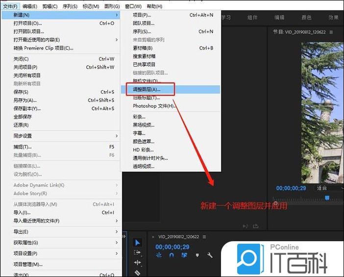 3、展开文件 菜单栏 ,在文件菜单栏中执行新建,选择新建调整图层,将新建后的调整图层应用到 视频轨道2.