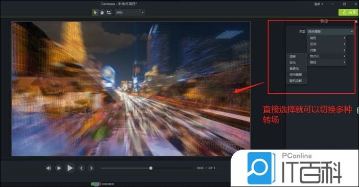 在Camtasia 9中有那么多的转场,我们怎么知道哪个转场适合我们的视频效果呢?这时候就需要更改切换多种转场来预览找到你想要的那个转场效果了。