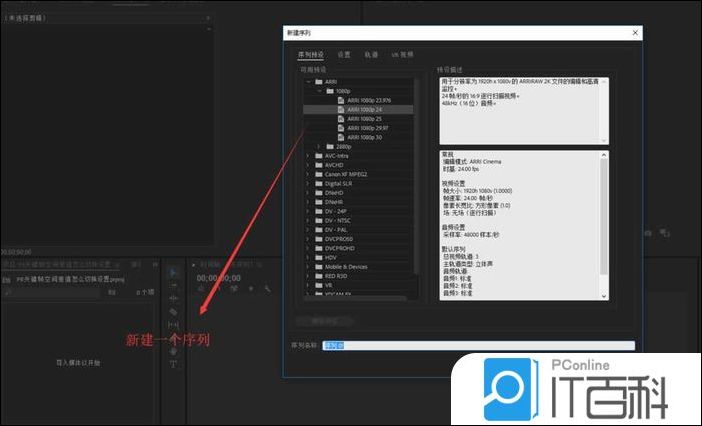 1、在一个空PR项目中新建一个 序列, 在新建序列对话窗中直接选择一个预设序列即可。