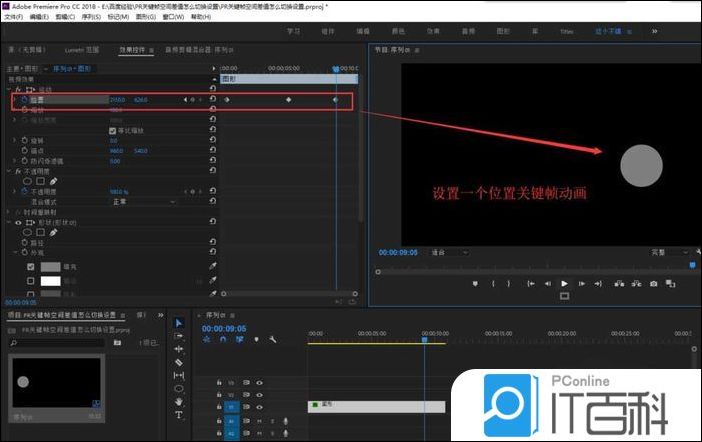 3、选择绘制的 正圆图形 ,在效果控件窗口中为当前的正圆图形设置一个位置的 运动关键帧动画 。