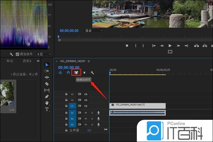 2、应用在时间轴视频轨道上的视频文件一般默认视频与音频是绑定的,我们选中视频,点击“ 链接选择项 ”按钮将视频与音频进行分离,方便我们下面添加效果。