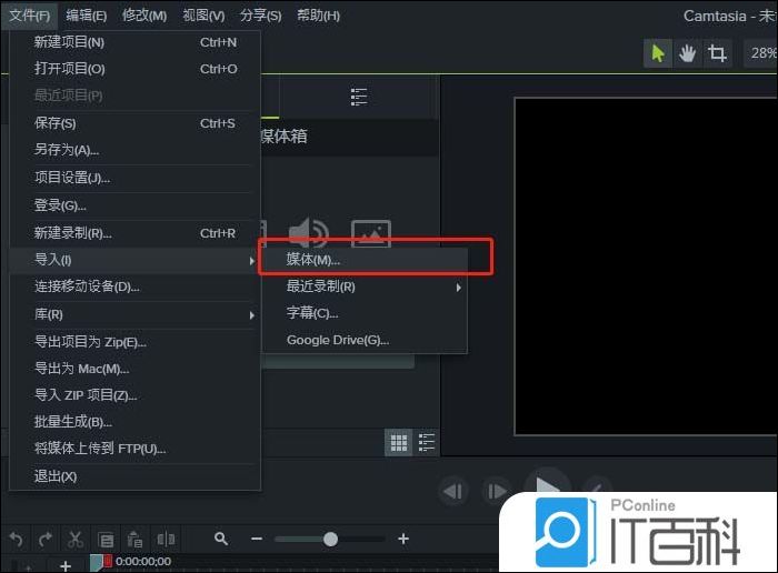 2、打开Camtasia 9软件只有默认是一 个空项目 ,我们在这个空项目中执行文件菜单中的导入命令。 选择媒体。
