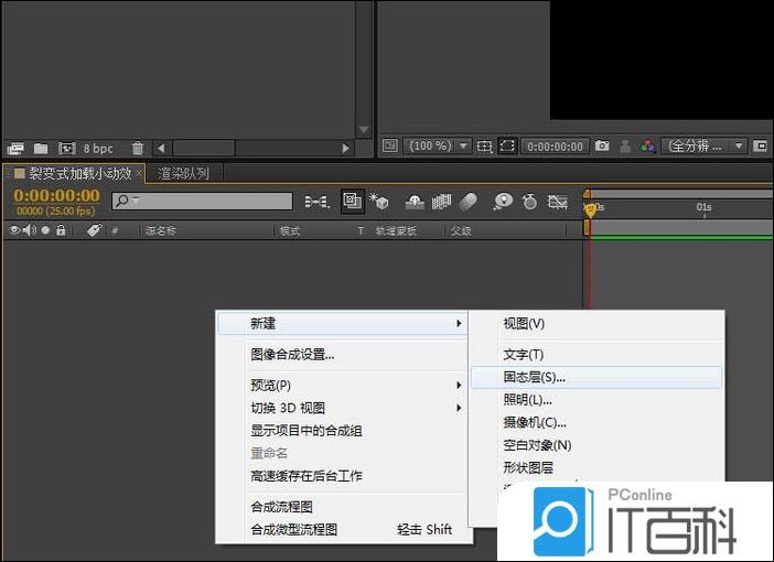 1、 CTRL+N 新建一个合成,命名为裂变式加载小动效,右击时间线新建一个 固态层 。