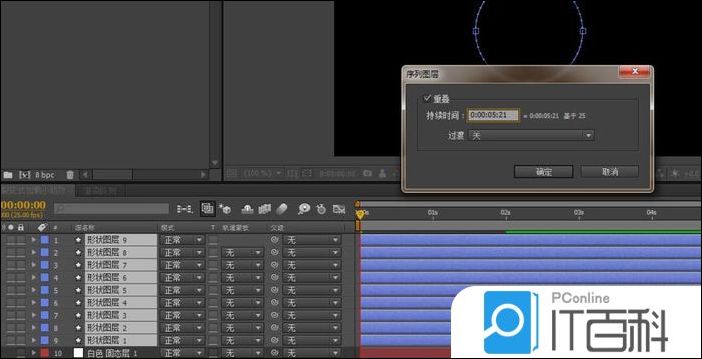 5、选中9个形状图层,右击 关键帧辅助 ,选择系列图层,选择时间点, 每个图层间隔4帧。