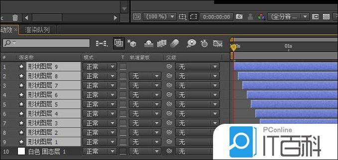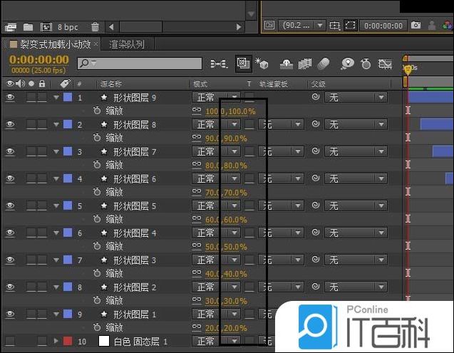 6、继续选中所有形状图层,同时打开 S键, 依次将每层的缩放值进行单独的有规律的调整,选中所有图层,同时打开T键, 从0到100,K两个关键帧, 这样有个慢慢显示的效果,按下空格键,就可以预览效果了。