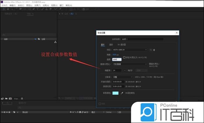 1、进入到AE编辑界面之后,按键盘 快捷键Ctrl+N 执行新建合成命令,弹出合成设置对话框,在这个对话框中设置好合成的参数。