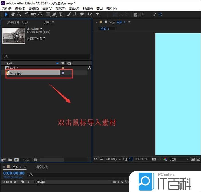 2、在AE的项目窗口的空白处 双击鼠标左键, 会弹出导入素材对话窗口,在该窗口中找到素材图片并导入到项目窗口中。