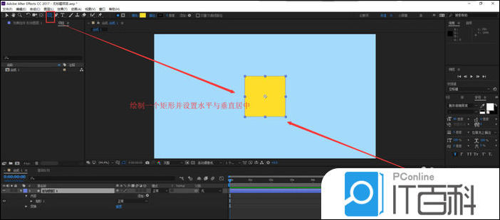 2、在合成中先使用 矩形工具 拖动鼠标来绘制一个合适大小的矩形,然后打开对齐窗口 ,设置矩形水平居中与垂直居中 。