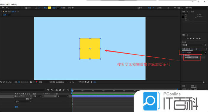 3、在效果与预设窗口中进行效果搜索,找到“ CC Cross Blur ”这个效果,并将这个效果拖动施加 给矩形图形。
