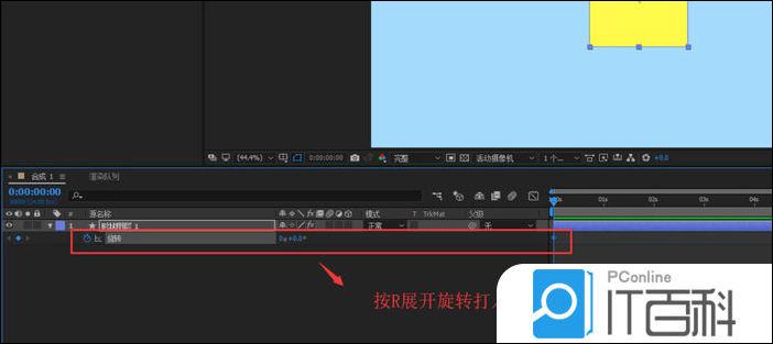 5、选中矩形图层, 按R展开旋转效果设置 ,在时间线0帧位置上打入旋转的第一个 关键帧 ,不设置旋转的数值。