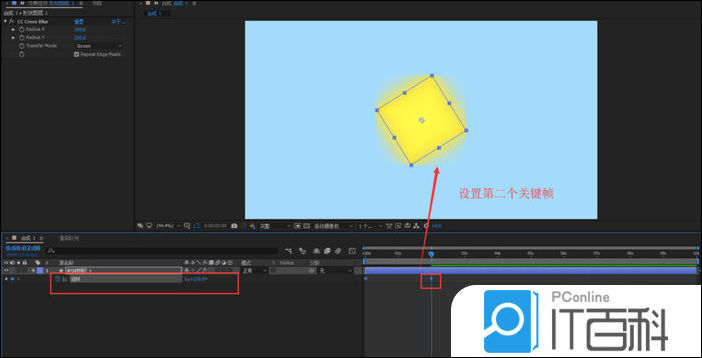 6、间隔合适的时间,在设置旋转的数值并生成 第二个旋转关键帧 。播放时间轴,一个旋转并发光的图形动画完成。