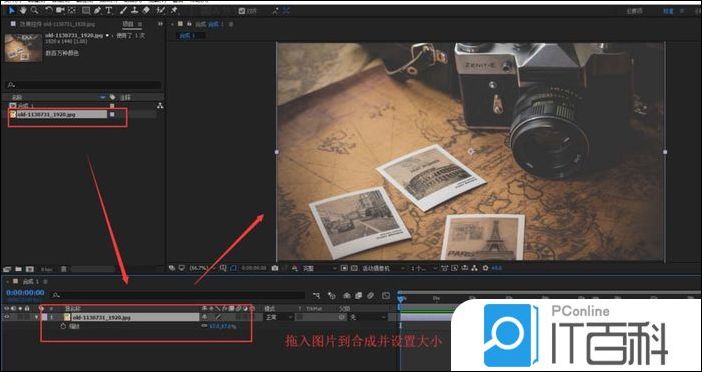 3、选中导入的图片素材,将其拖到合成1的图层中,并且找到图片的 缩放效果设置 ,将图片缩放到与合成大小基本一致。