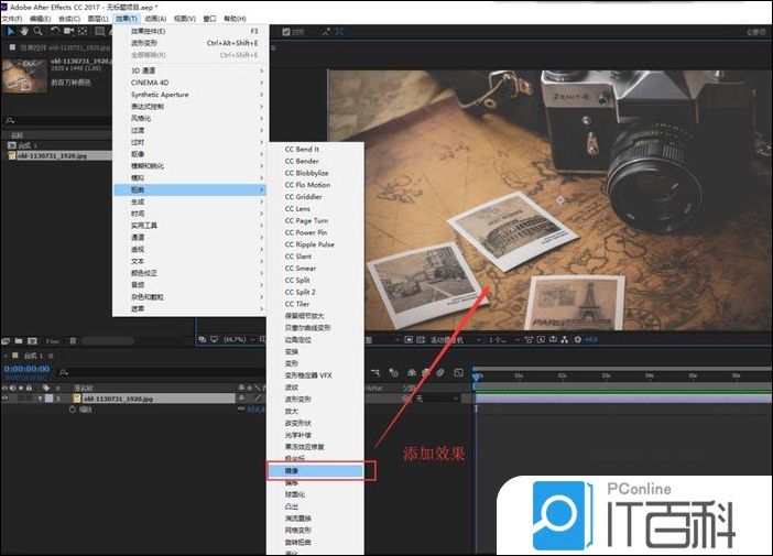 4、单击选择图片素材,展开AE中 效果菜单栏 ,在效果中找到 扭曲 中的“ 镜像 ”,将镜像这个效果拖到图片上。