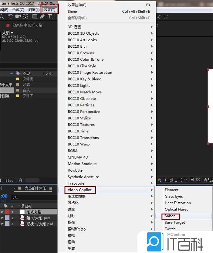 3、 ctrl+y 新建一个固态层,作为Saber插件的载体;选中固态层,添加 Saber效果 ; 效果-Video Copilot-Saber ;