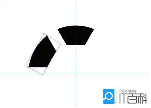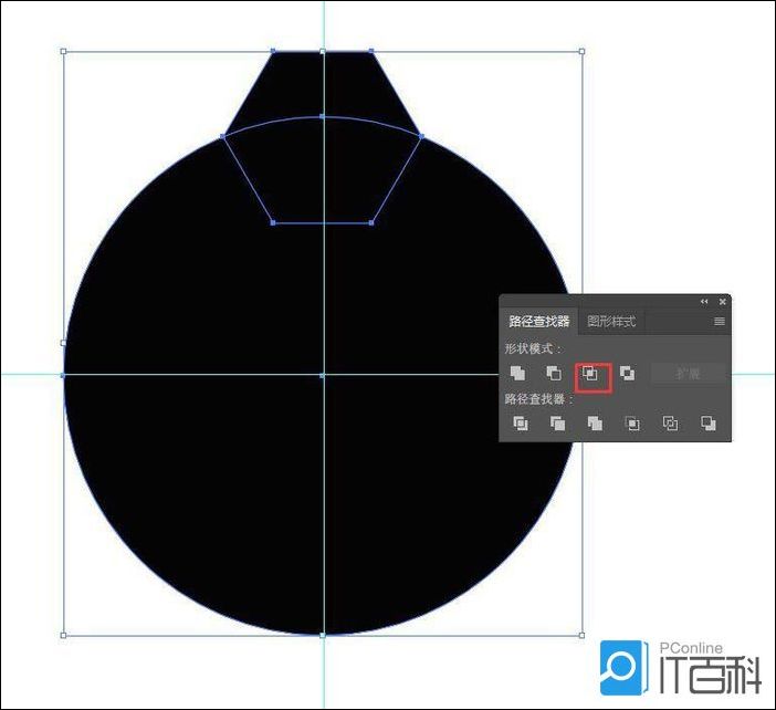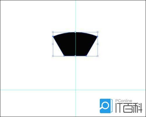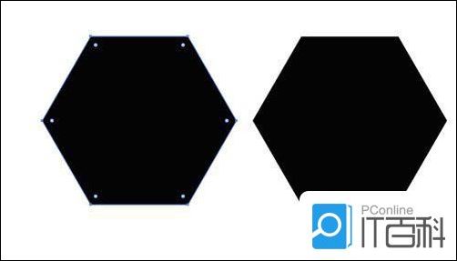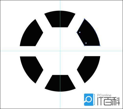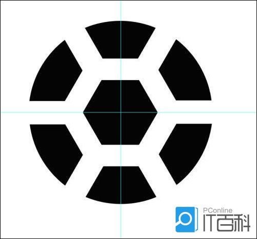 画一个正圆作为辅助图形,以圆心为中点,分别画一条垂直和水平的辅助线,与六边形结合,打开路径查找器,点击“ 集合 ”