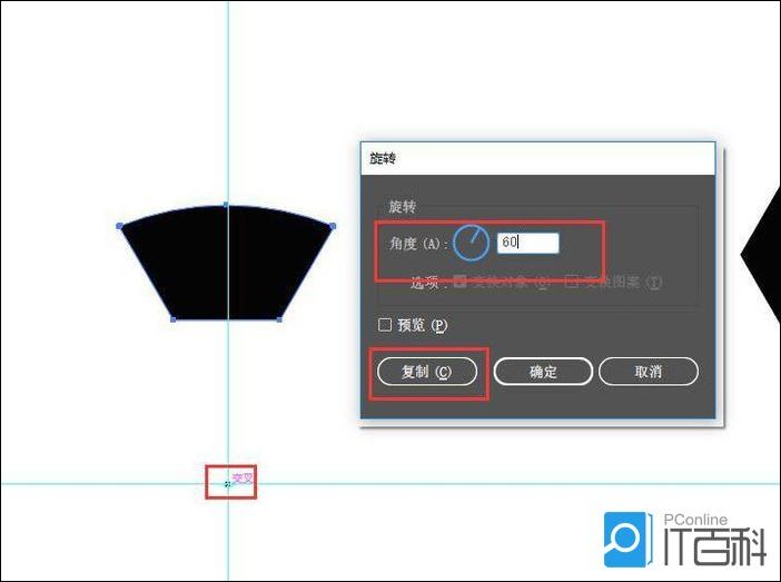 选中图形,选择 旋转工具 ,按住alt键,点击一点辅助线交点,弹出选框,角度选择60度,点击“复制”