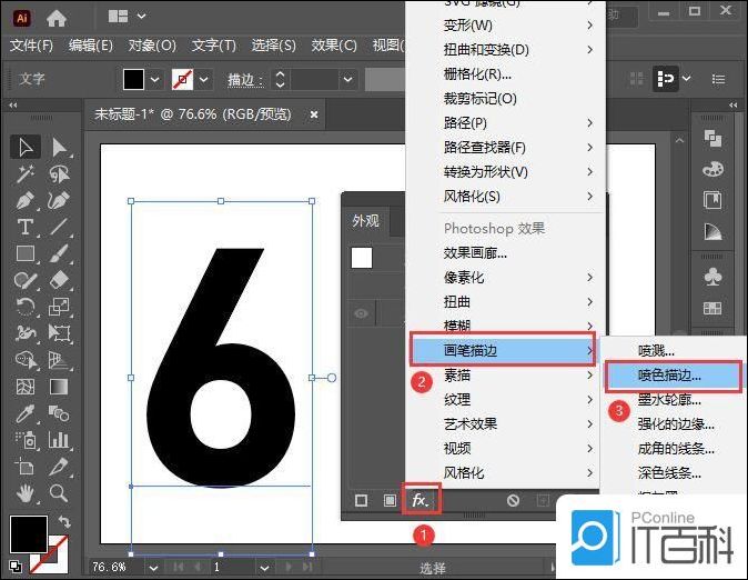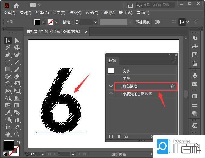 我们选中文字,然后在外观面板中点击 【fx】-【画笔描边】中选择【喷色描边 】,如图所示。
