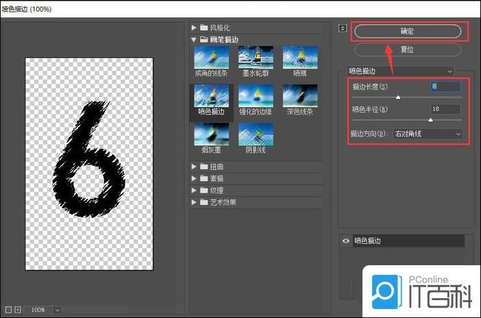 我们喷色描边里面,把描边长度设置为【8】,喷色半径为【18】,描边方向为【右对角线】,点击【确定】,如图所示。