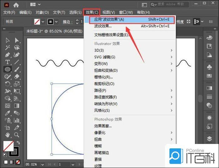 接下来,我们选中圆形,点击【效果】-【应 用“波纹效果” 】,如图所示。