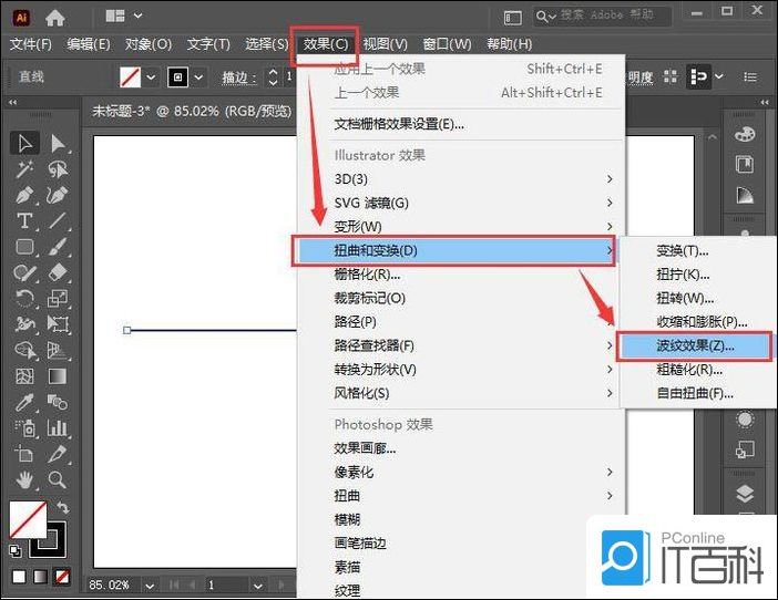 接着,我们选中直线,在【效果】【 扭曲和变换 】中选择【波纹效果】,如图所示。