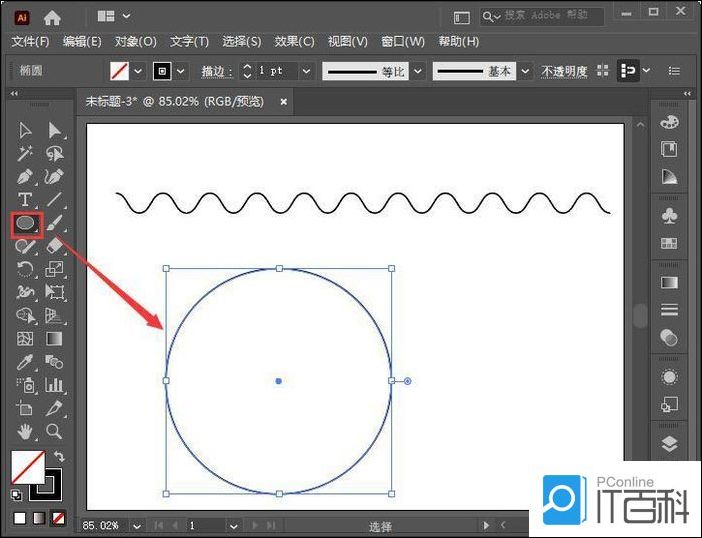 我们现在看到直线已经变成波纹线的效果了,然后用【椭圆工具】画出一个圆形,如图所示。