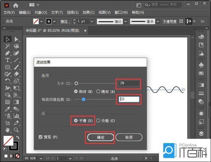 我们在波纹效果里面,把大小设置为2%,每段的隆起数为20,选择平滑,点击【确定】,如图所示。
