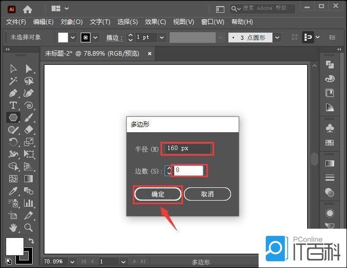 接着,我们单击画布任意空白处,然后把多边形的半径设置为【160px】,边数为【8】,点击【确定】,如图所示。