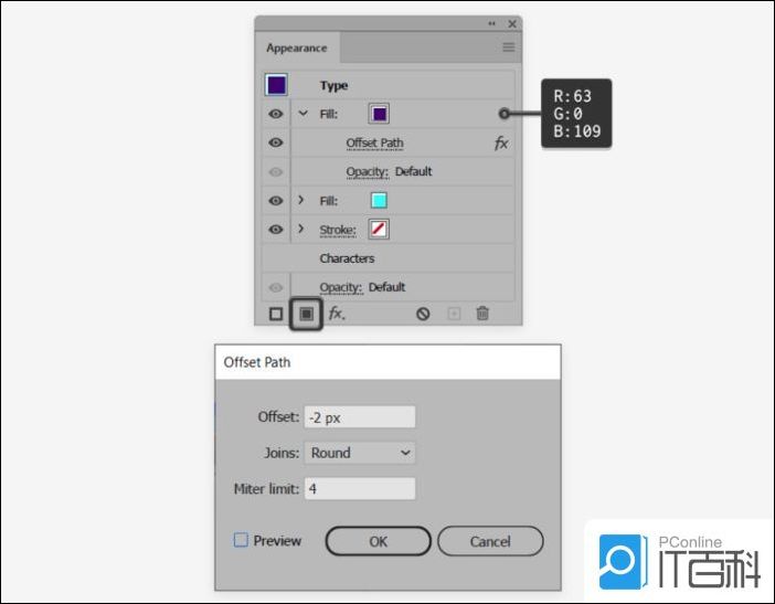 添加第二个填充并选择它.将颜色设置为 R = 63 G = 0 B = 109 并转到效果 > 路径 > 偏移路径.输入 -2 px 偏移,将“连接”设置为“圆”,然后单击“确定”.