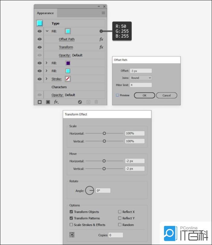 添加第三个填充并选择它.将颜色设置为 R = 50 G = 255 B = 255 并转到效果 > 路径 > 偏移路径.输入 -3 px 偏移,将“连接”设置为“圆”,然后单击“确定”.