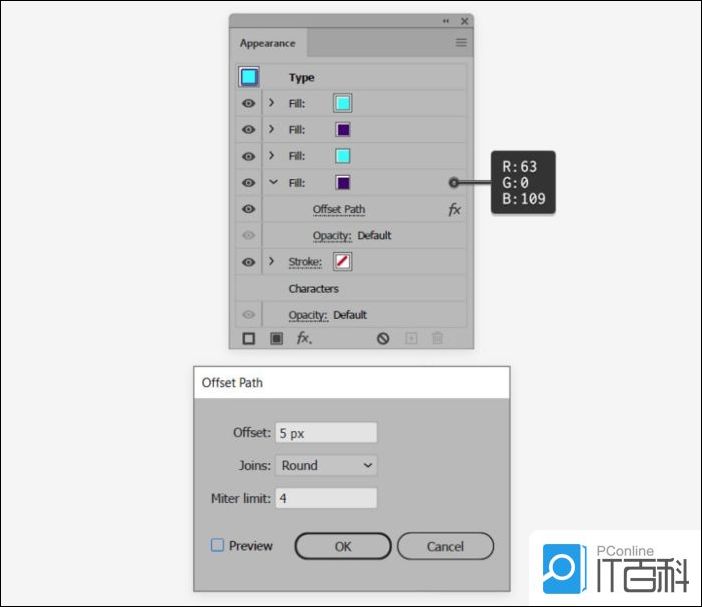 添加第四个填充,将其选中,并将其拖动到现有填充下方.将其颜色设置为 R = 63 G = 0 B = 109 并转到效果 > 路径 > 偏移路径.输入 5 像素的偏移量,将“连接”设置为“圆形”,然后单击“确定”.