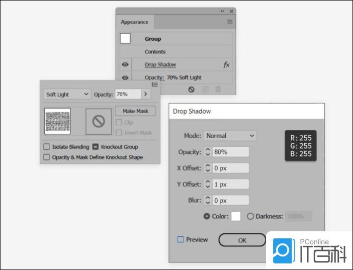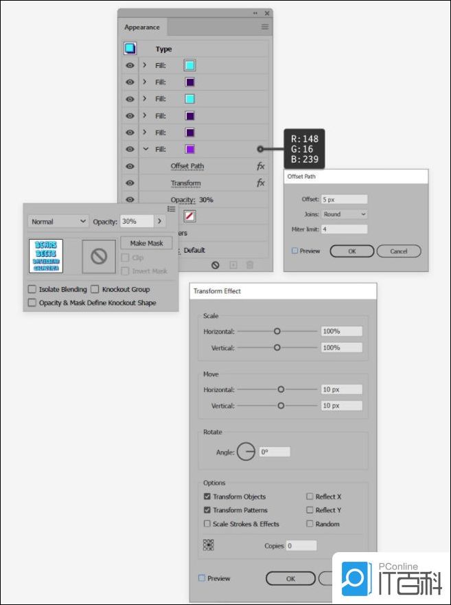 将焦点放在外观面板上,并使用小箭头按钮扩展此新填充.点击那个不透明度文本,打开 “透明度”弹出面板并将不透明度降低至 30 %.