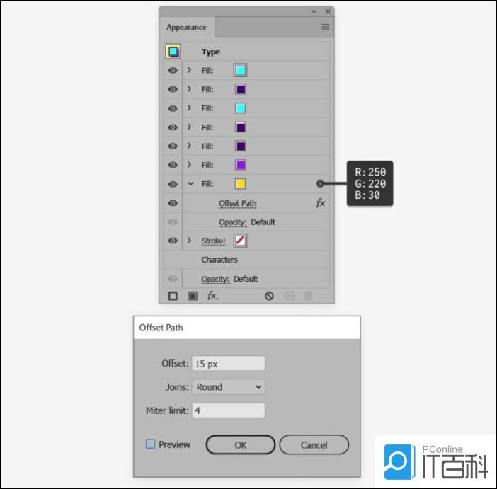 添加第七个填充,将其选中,并将其拖动到现有填充下方.将其颜色设置为 R = 250 G = 220 B = 30 并转到效果 > 路径 > 偏移路径.输入 15 像素偏移,将“连接”设置为“圆”,然后单击“确定”.