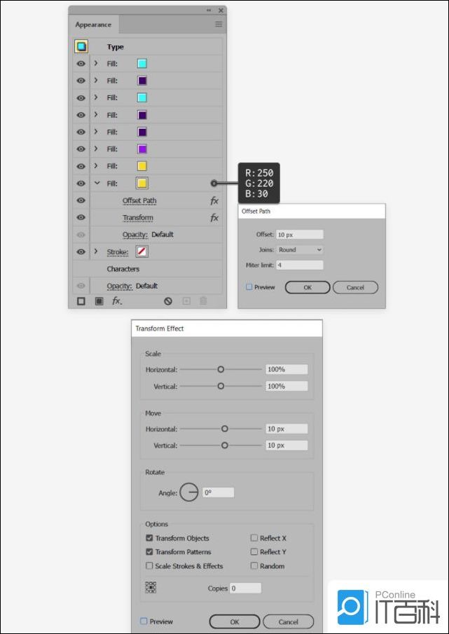 添加第八个填充,将其选中,并将其拖动到现有填充下面.将其颜色设置为 R = 250 G = 220 B = 30 并转到效果 > 路径 > 偏移路径.输入 10 像素偏移,将“连接”设置为“圆形”,然后单击“确定”.