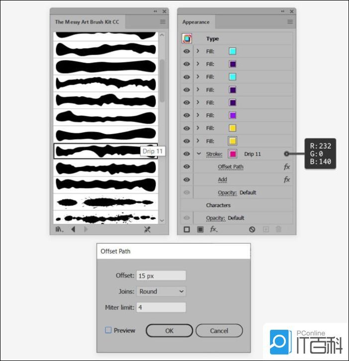 重新选择您的涂鸦文本,然后将焦点放在外观面板上.选择笔触,将其拖动到现有填充下方,然后应用 “滴水 11 ”艺术画笔.将其颜色设置为 R = 232 G = 0 B = 140 并转到效果 > 路径 > 偏移路径.输入 15 像素偏移,将“连接”设置为“圆”,然后单击“确定”.重新选择笔触,然后转到“效果” > “路径查找器” > “添加”.