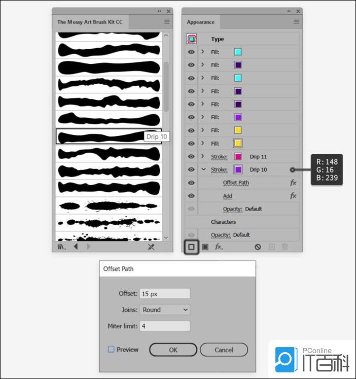 使用 “添加新笔划”按钮添加第二笔划,将其选中,然后将其拖动到现有笔划下方.应用滴灌 10 美工笔刷,将其颜色设置为 R = 148 G = 16 B = 239 ,然后转到效果 > 路径 > 偏移路径.输入 15 像素偏移,将“连接”设置为“圆”,然后单击“确定”.重新选择此新笔触,然后转到“效果” > “路径查找器” > “添加”.