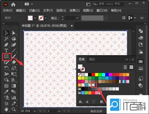 我们用【 矩形工具 】画出一个比较大的矩形,然后单击色板中刚刚拖进来的图案。