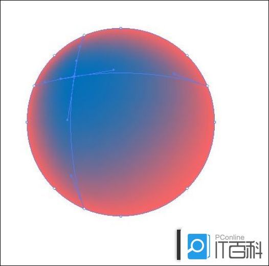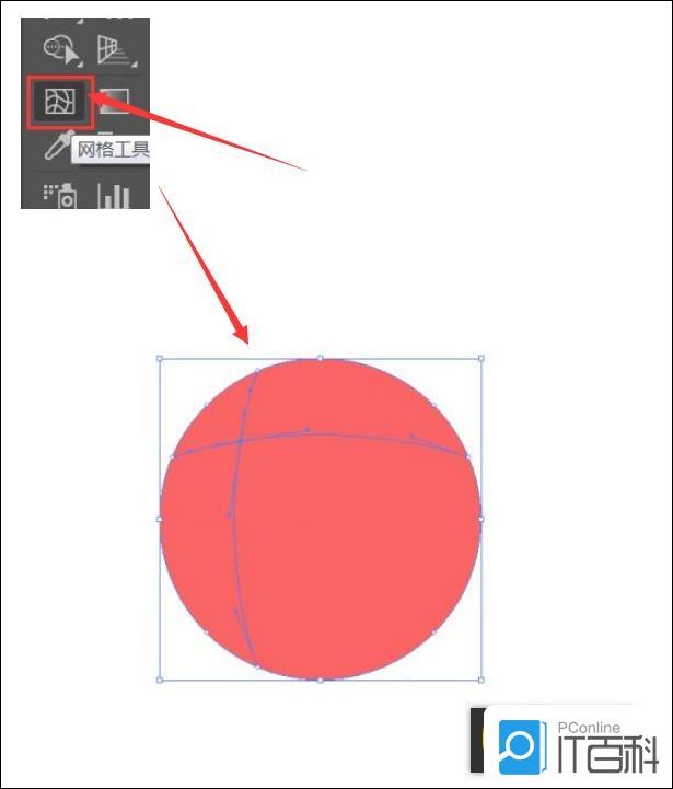 选择网格工具在点击圆上的位置,出现两条弧线;