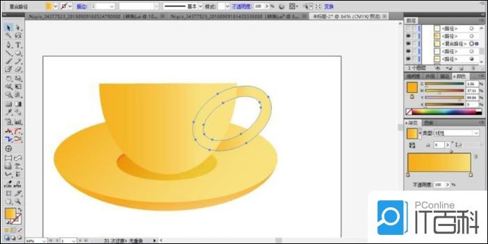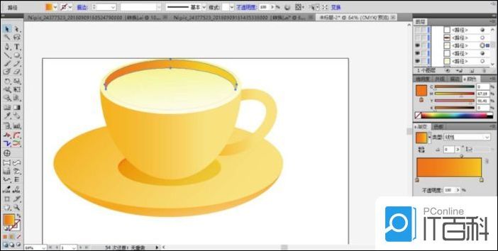 4、这一步开始绘制咖啡杯了,我们先画出咖啡杯的杯身形状并填充为橙色的渐变,再用 复合路径 的方法让两个椭圆形组成一个圆环作为咖啡杯的把手并填充为橙色。