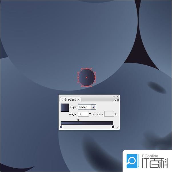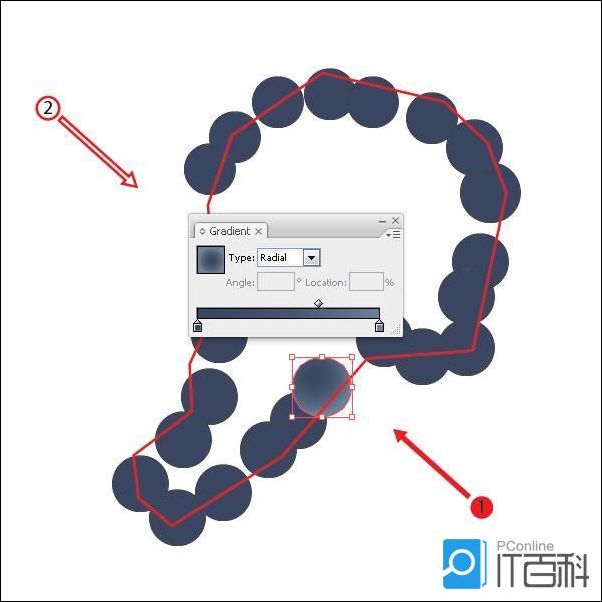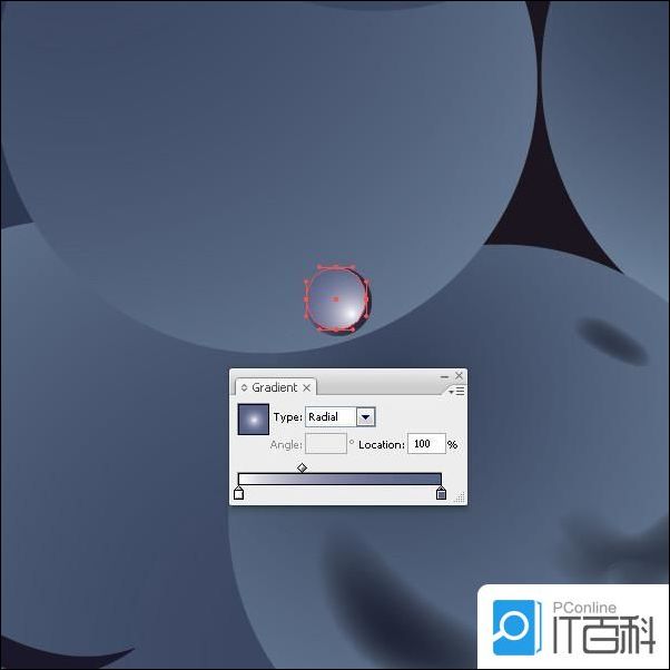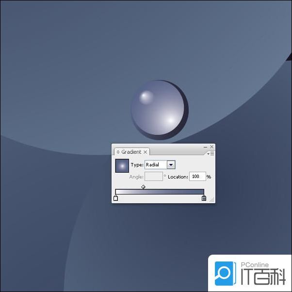 改变这个浆果的立体填充颜色为一个径向渐变。从位于最靠近这第一光源的浆果开始,用一个蓝色(C= 83, M= 72, Y= 39 and K= 26)到亮蓝色(C= 62, M= 44, Y= 27 和K= 2)的径向渐变,然后使用这个渐变工具(G)根据光源的位置适当地整理颜色。