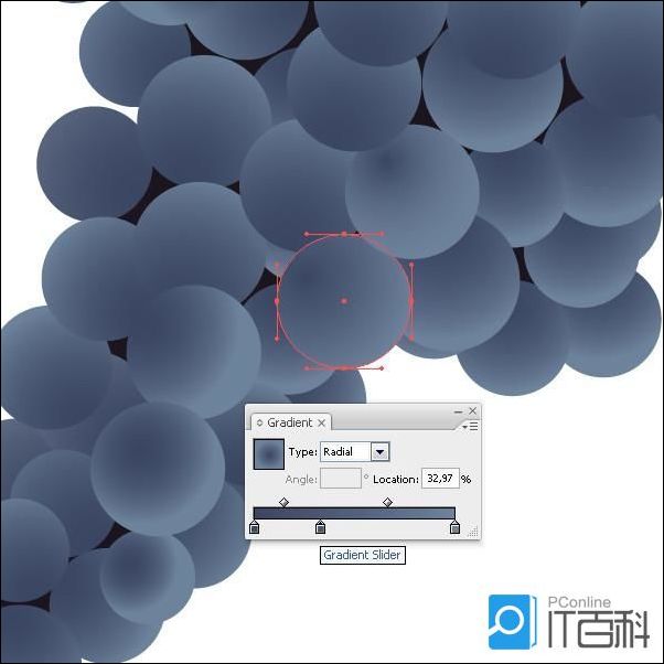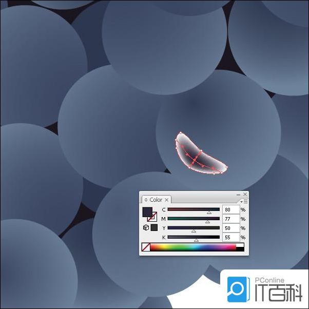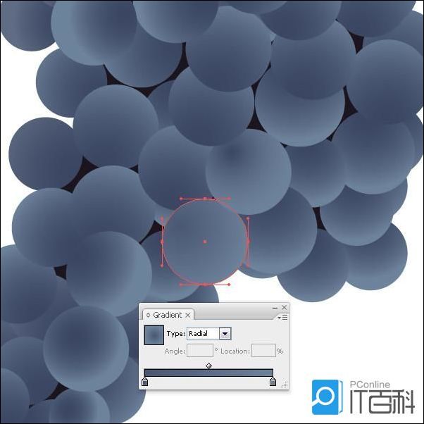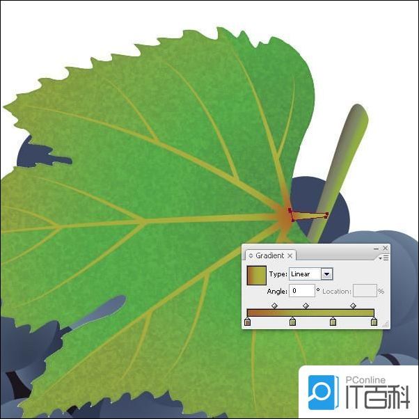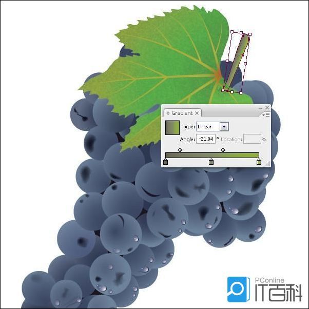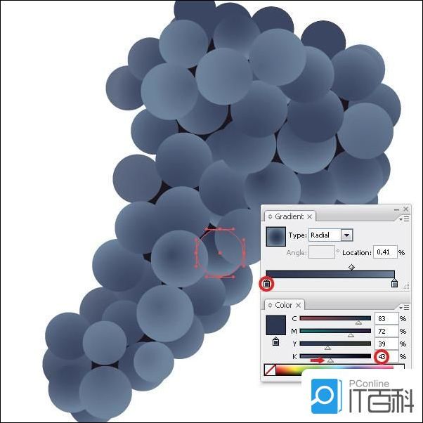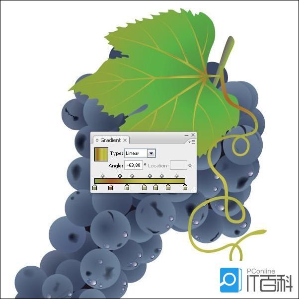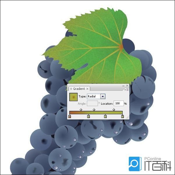 使那些重叠其它浆果附有阴影的葡萄变暗,要这样做,在渐变面板选择左边的滑块并且改变它的颜色为一个暗一点的,增加调色板K的值,为剩余浆果重复这个方法。这个事情比较辛苦,但是很兴奋。