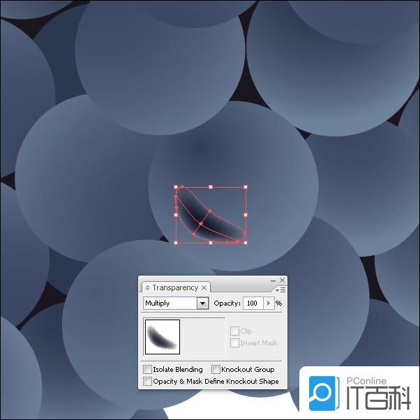 现在我们将在这些浆果上创建磨损和擦痕。使用钢笔工具(P)在浆果的表面创建一个“豆形糖果”形状并且用白色填充它。使用网格工具(U)在创建的形状中心设置一个网格点,改变这个点的颜色为 (C= 80, M= 77, Y= 50 and K= 55),用选择工具(V)再次选择这个形状并且在不透明度的混合模式中改变这个混合模式为正片叠底。