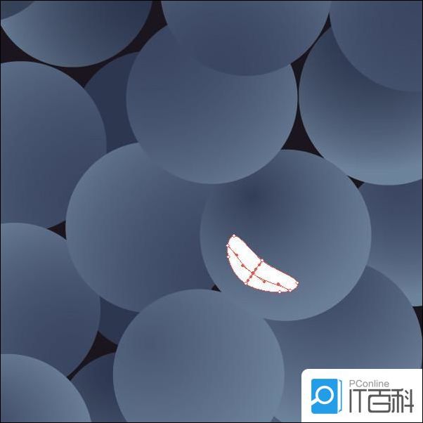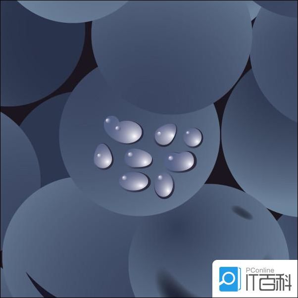 是要在葡萄上创建一些水滴的时候了,使用椭圆工具(L)并用一个线性渐变蓝( (C= 75, M= 62, Y= 58 and K= 8 )到暗一些的蓝(C= 80, M= 77, Y= 50 并且 K= 55)创建一个椭圆,现在用一个径向渐变填充从白到蓝(C= 75, M= 62, Y= 28 and K= 8 )创建另一个比第一个小一点的椭圆,最后,创建另外的椭圆,比这第二个小一些,设置这同一个径向渐变填充,但改变这个中心点位置,这是创建水滴的一个非常简单有效的方法。