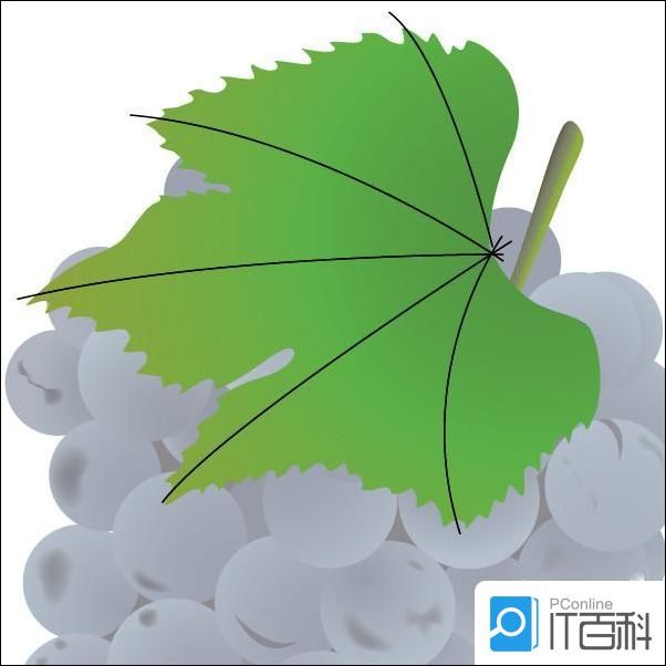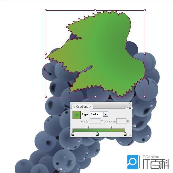 在“葡萄”图层的顶部创建一个新图层并命名它为“叶子”,使用钢笔工具(P)创建一个叶子形状,用三个深浅不一的绿色1 (C= 72, M= 22, Y= 100 and K=6), 2 (C= 68, M= 7, Y= 100 and K= 0), 3 (C= 50, M= 20, Y= 100 and K= 2)的径向渐变来填充这个叶子。