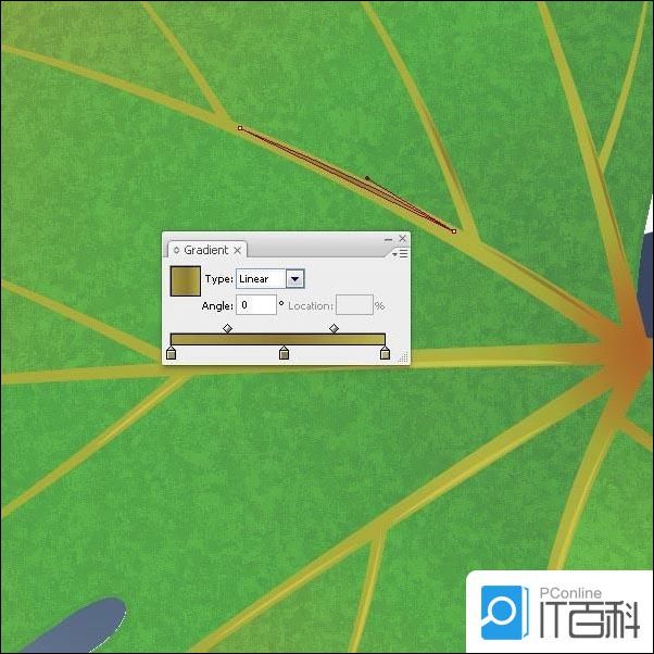 划分这个叶子为几个部分,正如下图显示的用钢笔工具(P)创建五条线,选中所有的线和叶子的形状并按路径查找器的分割按钮,取消群组这些叶子元素并且借助渐变工具(G)调整每一段的渐变填充。这个操作将给我们的图像增添真实感。