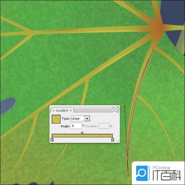 将添加叶的静脉,使用钢笔工具(P)并在叶脉上创建反射光和阴影,使用如下线性渐变颜色反射:1 ? (C= 23, M= 15, Y= 87 and K= 0) 2 ? (C= 27, M= 17, Y= 89 and K= 0);浅性渐变的阴影:1 ? (C= 36, M= 30, Y= 95 and K= 4), 2 ? (C= 42, M=43, Y= 96 and K= 15), 3 ? (C= 29, M= 20, Y= 90 and K= 0)。
