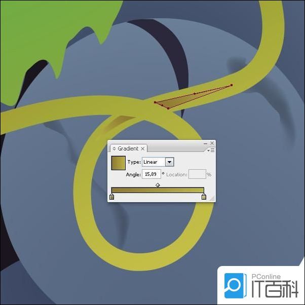 用一个深浅不同三个颜色1 (C= 54, M= 50, Y= 65 and K= 27, 2 (C= 50, M= 35, Y= 65 and K= 10), 3 (C= 49, M= 15, Y= 100 and K= 1)的浅性渐变创建一个叶柄形状,使用钢笔工具(P)创建一个叶子和分枝之间的茎,并用和叶子脉络同样的渐变填充它。
