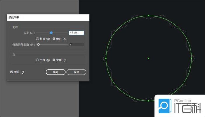 3.创建一个圆,执行效果-扭曲和变换-波纹效果,起伏段数自定,,角越多,后面贴图的时候会越卡,根据自己电脑来吧。当然,这个多角的图形也能使用星形工具,设置角点数,两个半径值来实现。