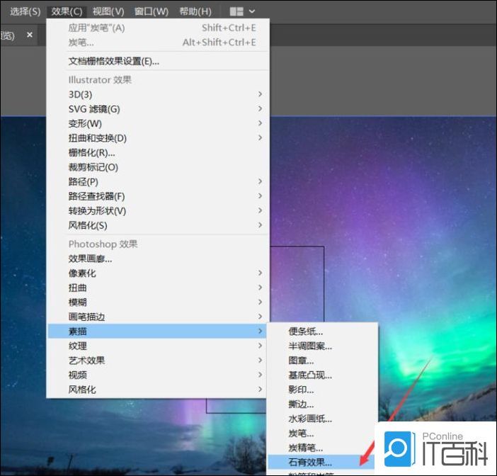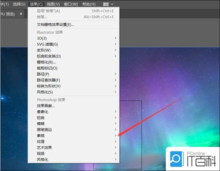 如箭头所示,在“效果”下选框中选择“素描”的右选标点击。