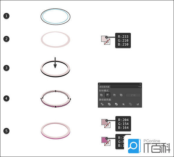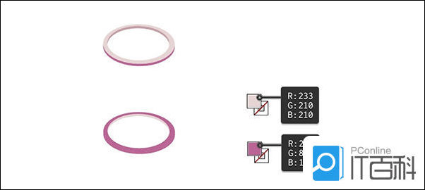 再次选择原始环,然后复制并粘贴到本位,以制作另一个副本。 将此环的新副本与黑色环一起选中,然后在“路径查找器”面板中按相减, 将所得到的两个形状放到后面一层,如图(4),并用两个紫色进行填充,如图(5)所示。然后把制作好的洋葱环打包为一个组,命名为“洋葱环1”